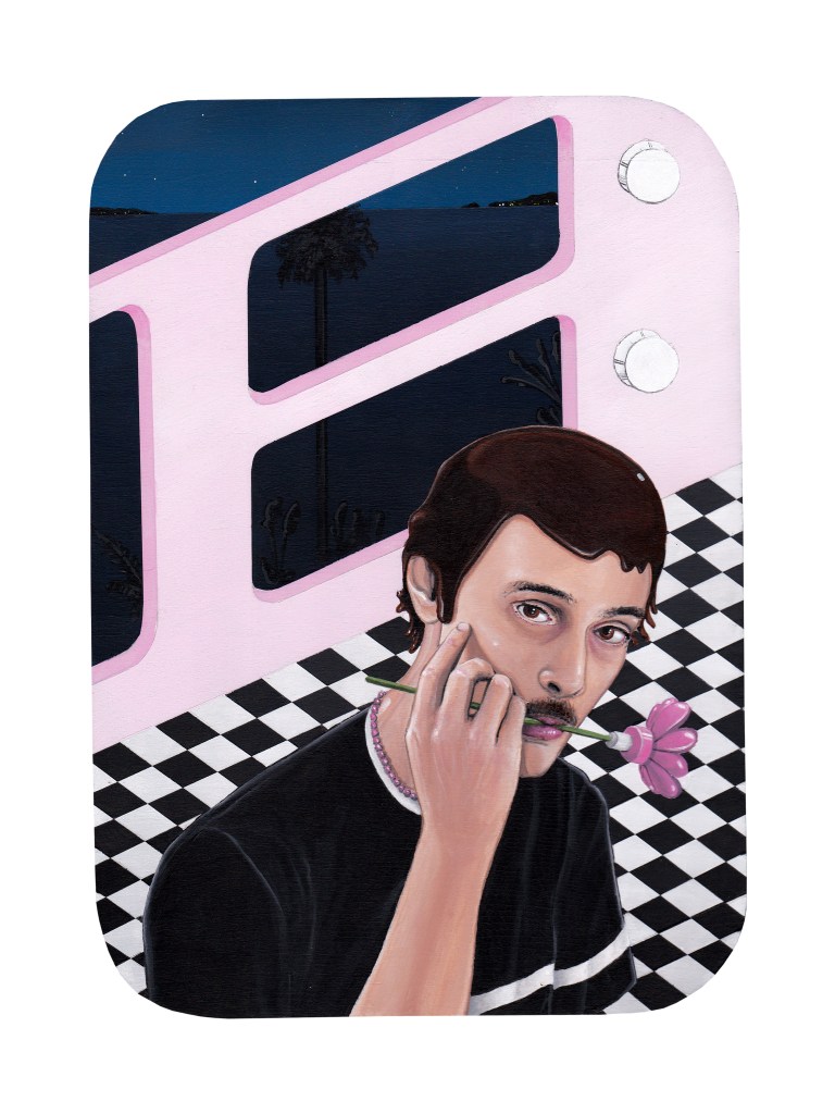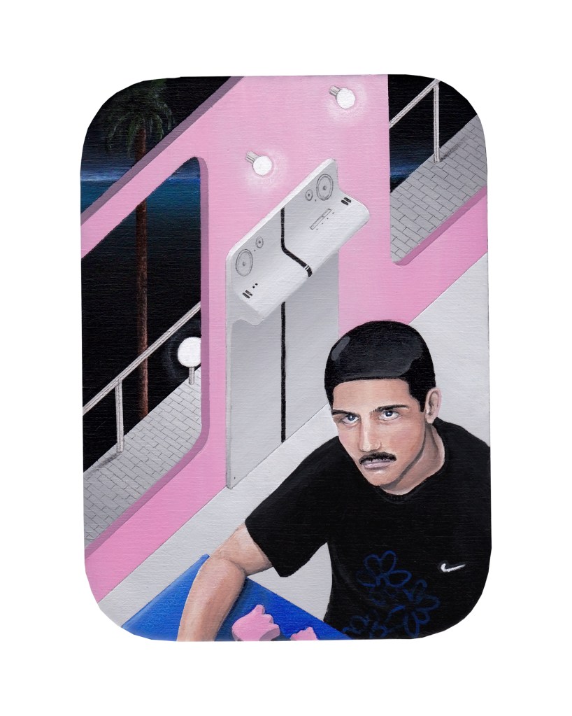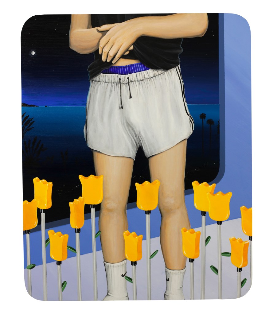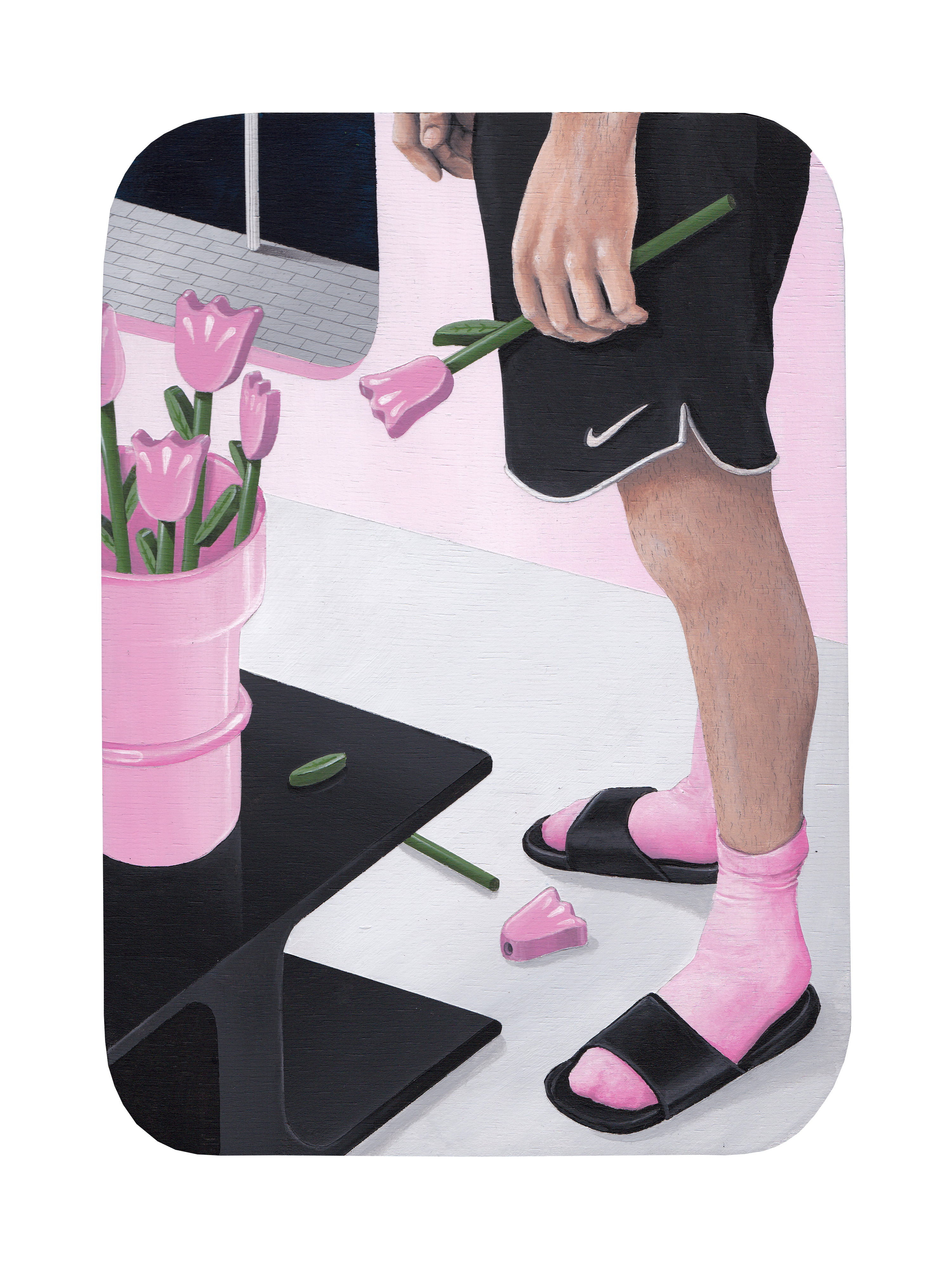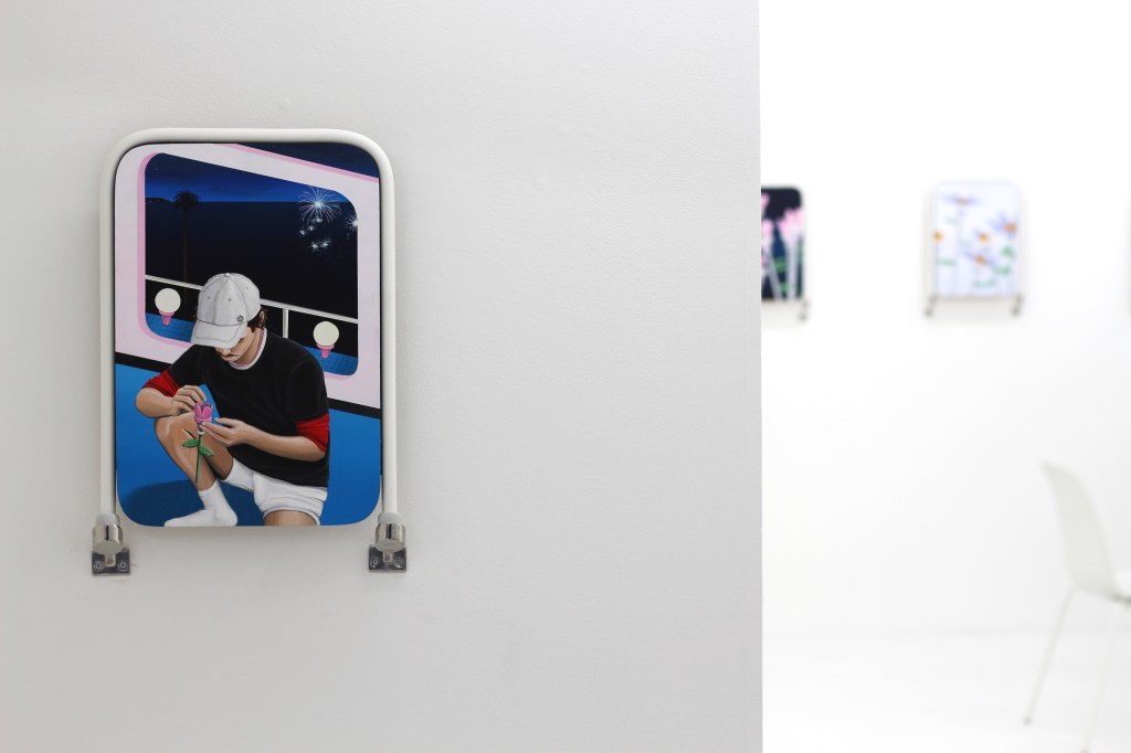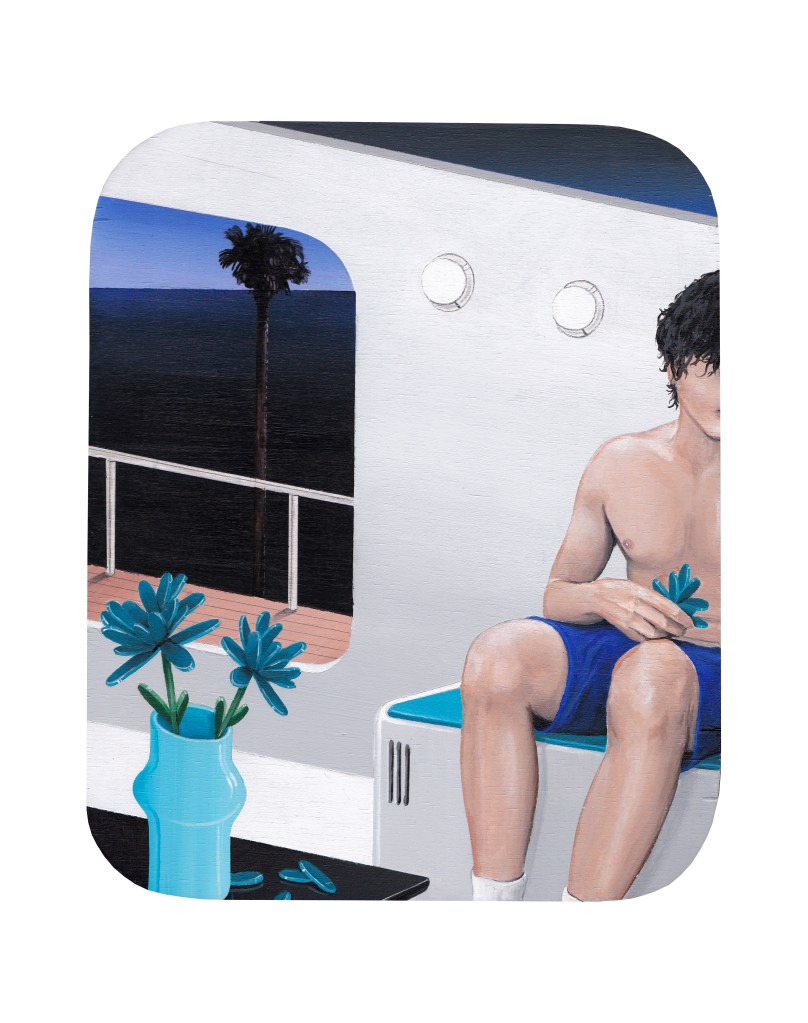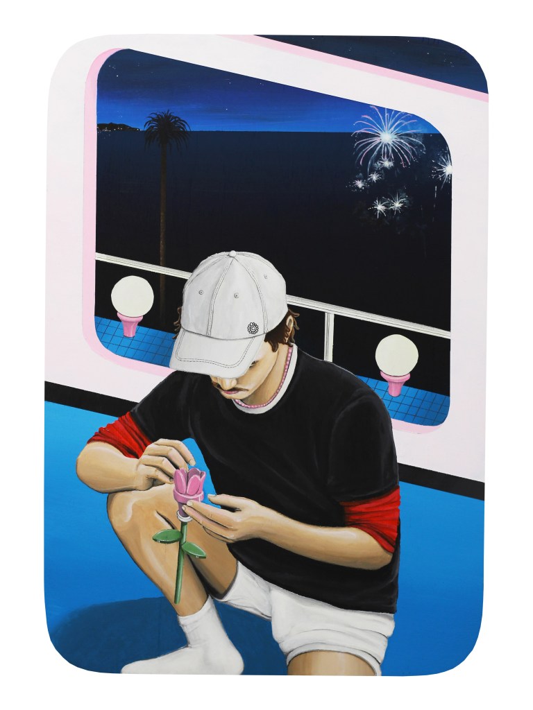 En mêlant une vision atemporelle et universelle à son imaginaire intime, l’artiste vous invite à un voyage surréaliste et captivant. Les figures masculines à la plastique parfaite sont placées dans une atmosphère onirique apparemment exempte de narration, entraînant le voyageur dans une quête du beau idéal. Ces silhouettes fantasmagoriques s’inscrivent harmonieusement dans un univers entièrement recomposé par l’artiste au gré de ses souvenirs et d’images contemporaines. J’imagine un monde futuriste où les corps et habitations semblent composés de plastique et se confondent l’un dans l’autre. Dans un monde où les fleurs auraient disparu, il imagine des fleurs artificielles aux couleurs vives qui ponctuent les compositions à la manière d’une mélodie envoûtante.