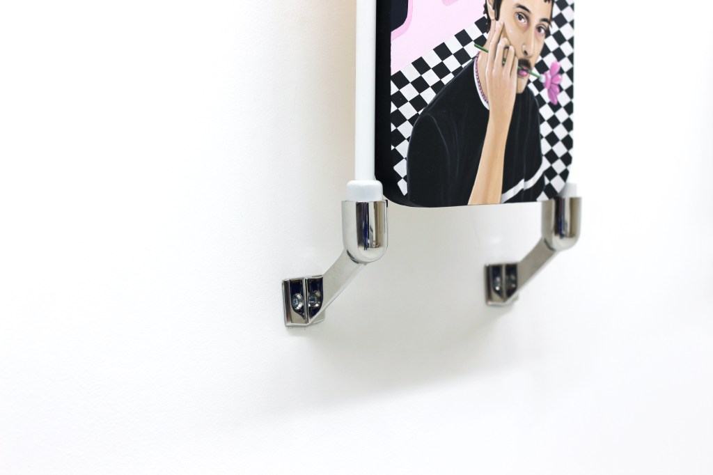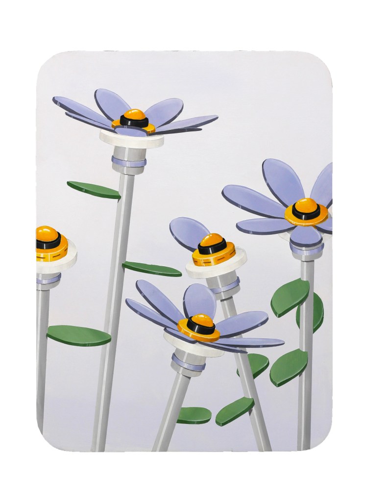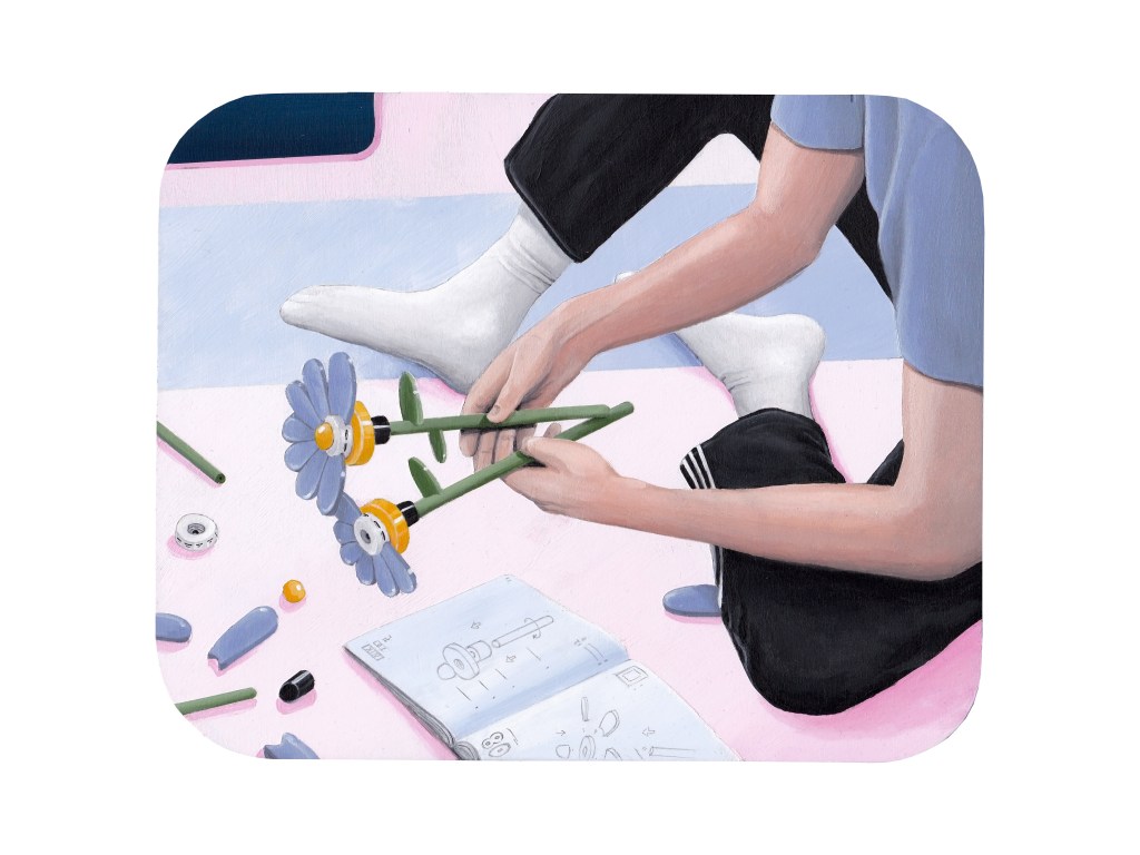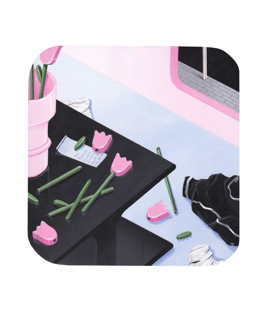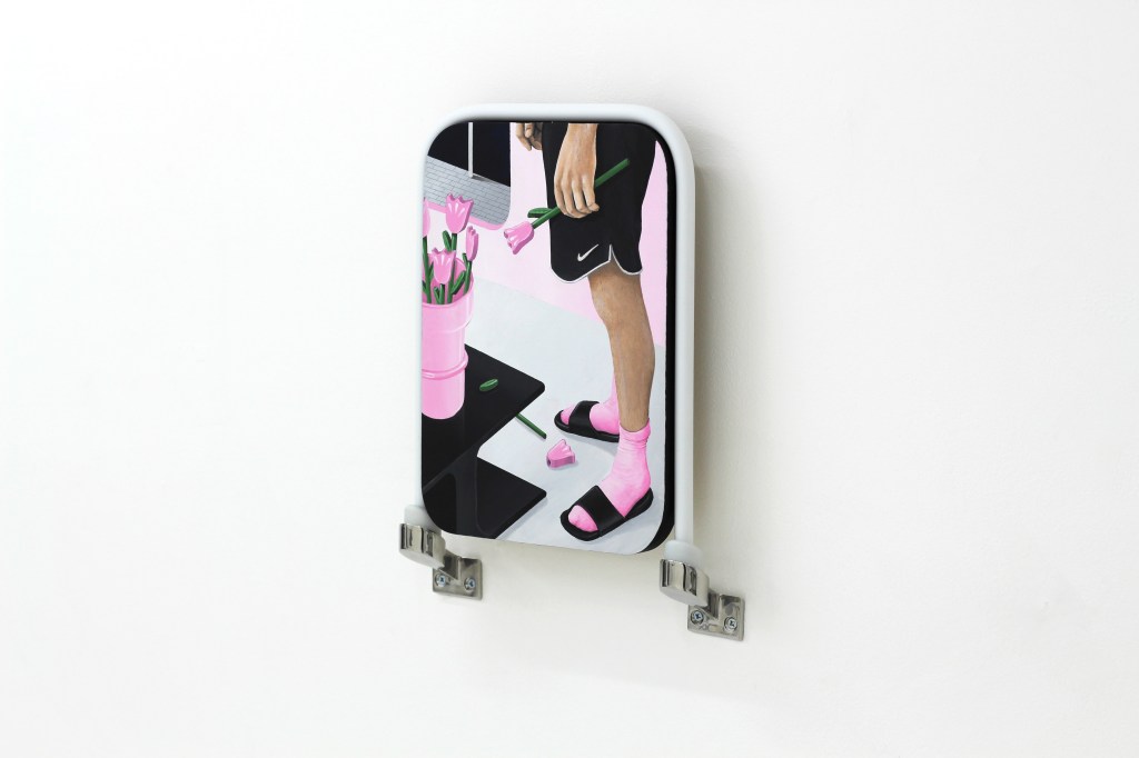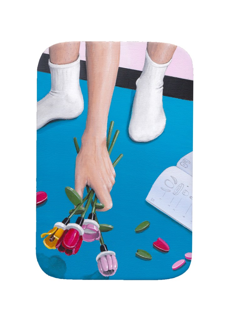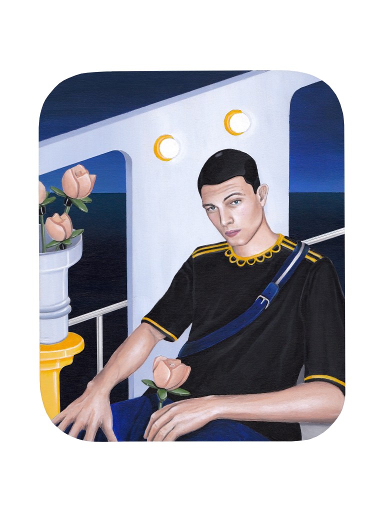 En mêlant une vision atemporelle et universelle à son imaginaire intime, l’artiste vous invite à un voyage surréaliste et captivant. Les figures masculines à la plastique parfaite sont placées dans une atmosphère onirique apparemment exempte de narration, entraînant le voyageur dans une quête du beau idéal. Ces silhouettes fantasmagoriques s’inscrivent harmonieusement dans un univers entièrement recomposé par l’artiste au gré de ses souvenirs et d’images contemporaines. J’imagine un monde futuriste où les corps et habitations semblent composés de plastique et se confondent l’un dans l’autre. Dans un monde où les fleurs auraient disparu, il imagine des fleurs artificielles aux couleurs vives qui ponctuent les compositions à la manière d’une mélodie envoûtante.