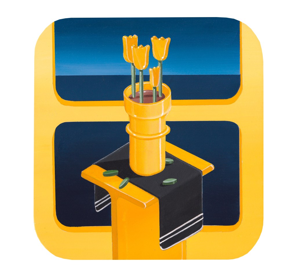 D’ailleurs, les cadrages originaux et resserrés – imaginés comme un point de vue caméra – nous privent souvent d’une partie de l’image, et participent de cette dualité surréaliste qui exalte notre sensation d’inconfort. Concilier les contrastes dans un tout unifié par une ligne précise et des couleurs franches. Ce sont ces mêmes plages colorées acidulées qui induisent ces jeux de fausse perspective. De la même manière que David Hockney transformait un espace apparemment plan en une surface tridimensionnelle grâce à ses larges zones de couleur pure, la palette lisse et épurée de Bosphore lui permet de creuser la profondeur de ses oeuvres.