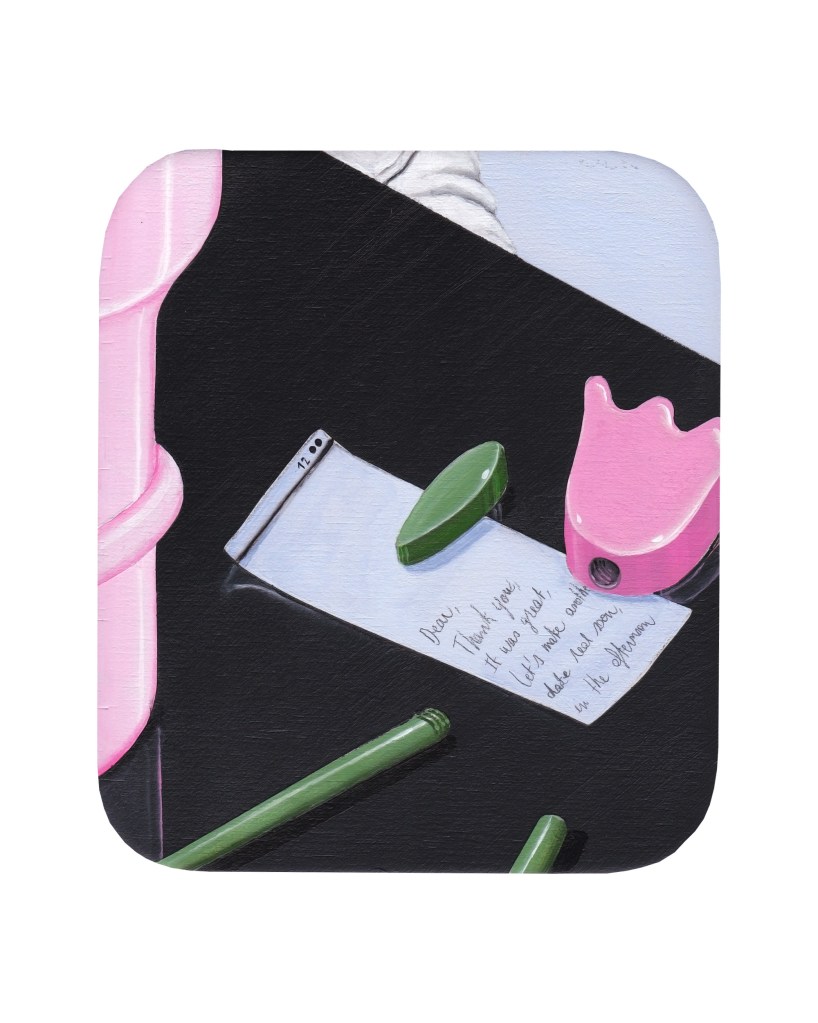 Ces dernières permettent de créer un contraste entre le corps masculin, la sensibilité mais aussi la délicatesse requise à l’assemblage d’une fleur. Ces slumber parties prennent une place primordiale pour l’homme du futur, et l’artiste imagine un monde où virilité et masculinité se confondent avec sensibilité. L’image de l’homme moderne est éprouvée par l’environnement dystopique et futuriste qui l’entoure, et l’œuvre s’enrichit d’une nouvelle lecture, celle de la critique de la société contemporaine qui semble danser immuablement dans une nuit artificielle. En l’absence de narration, le spectateur cherche à offrir un récit imaginé aux personnages et objets, et l’œuvre trouve ainsi son achèvement dans l’esprit du regardeur. Malgré une planéité exacerbée par les aplats de couleur vive, Jean Bosphore parvient à rendre la profondeur de ses espaces avec virtuosité, tout en jouant sur l’incertitude entre intérieur et extérieur.