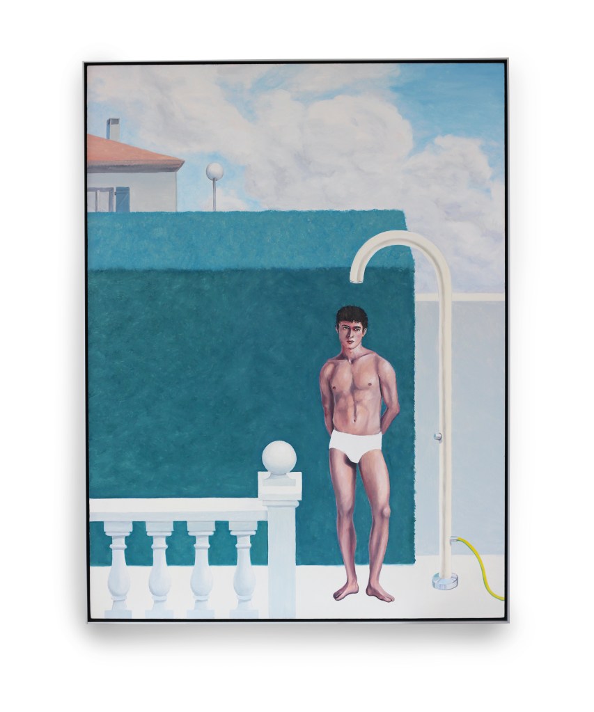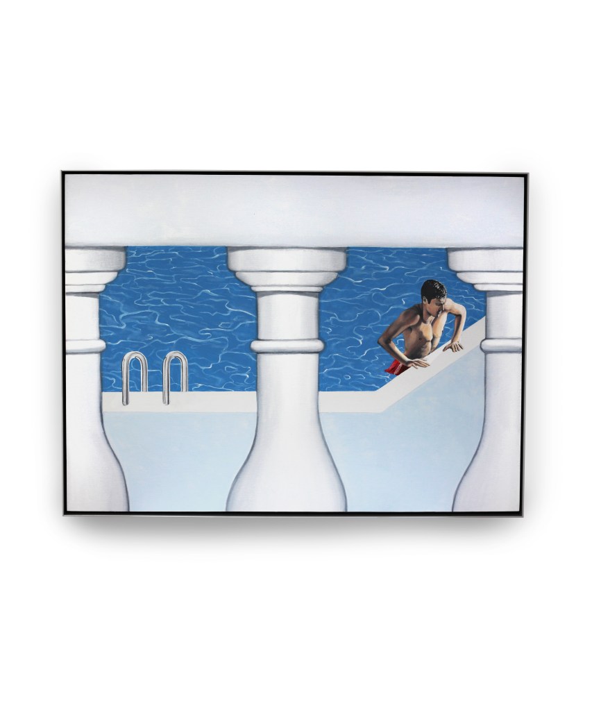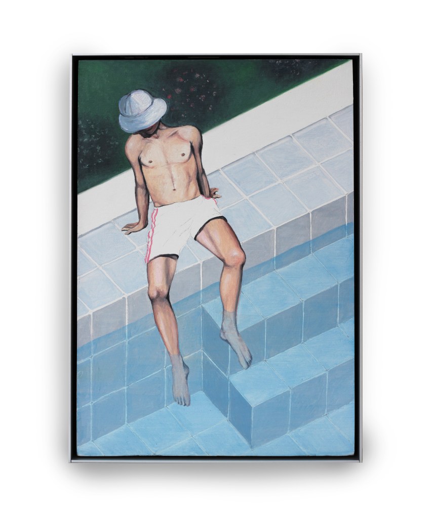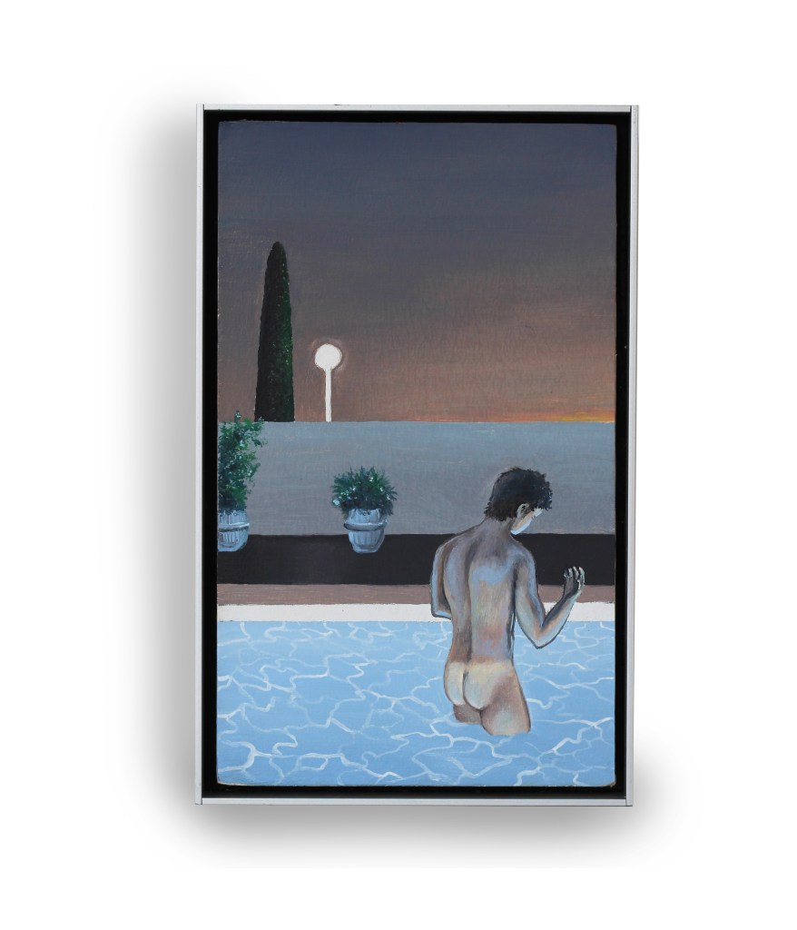 Sebastien à la piscine – 51×42 x3cm – huile sur bois 2024