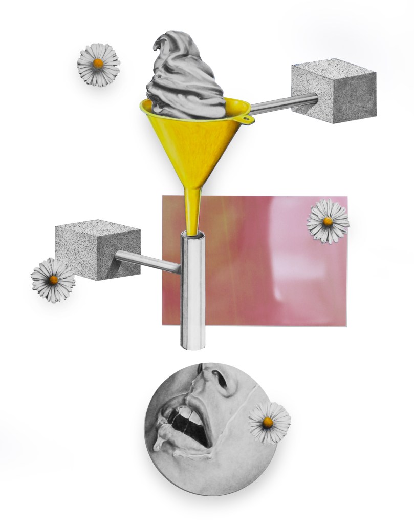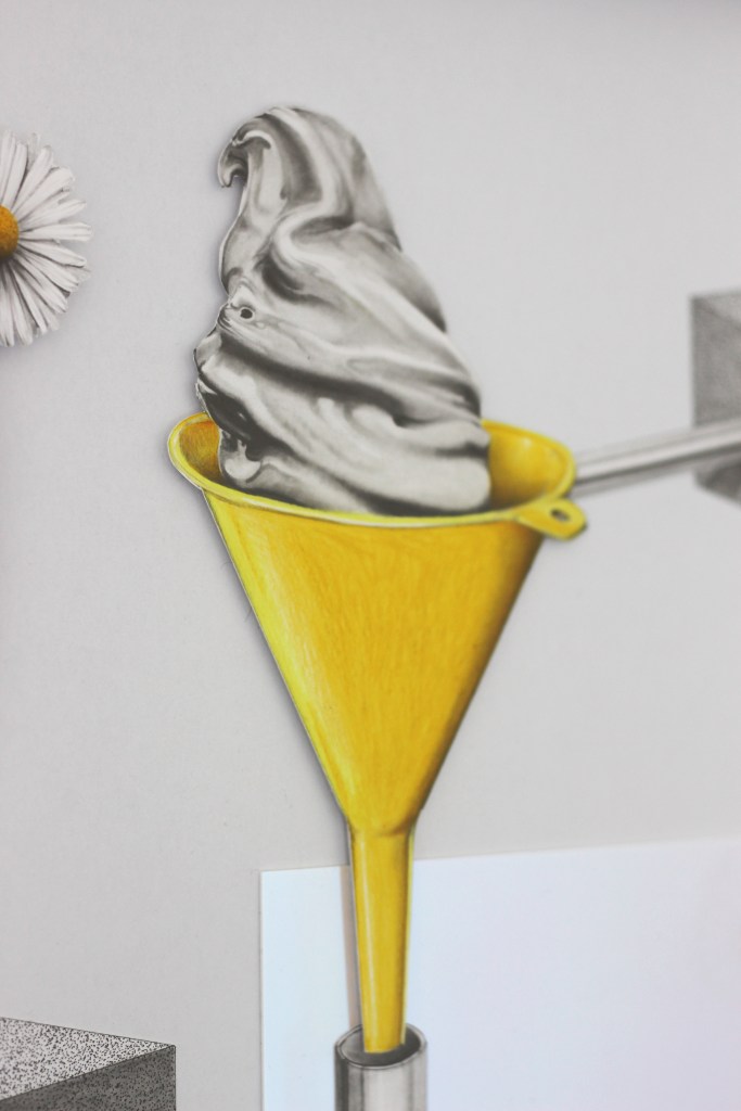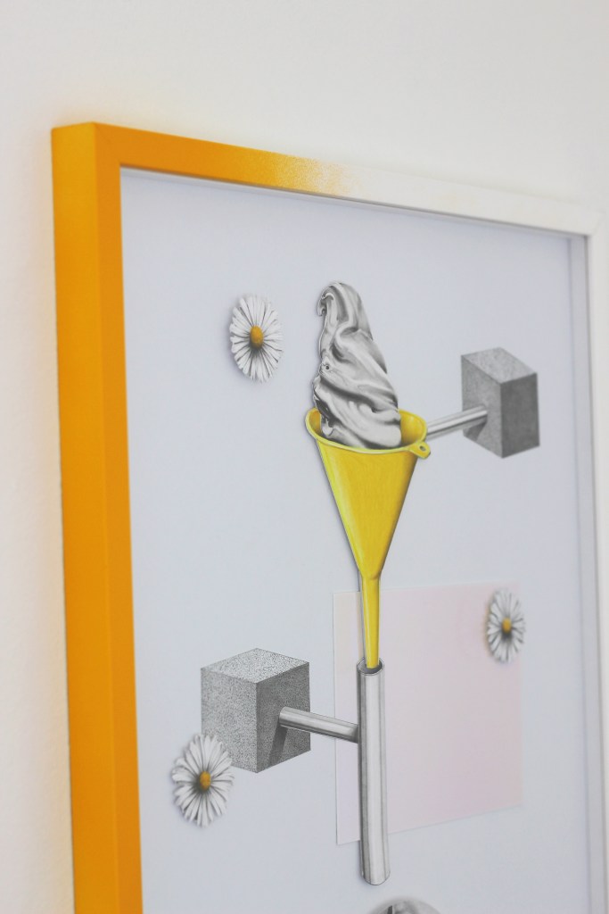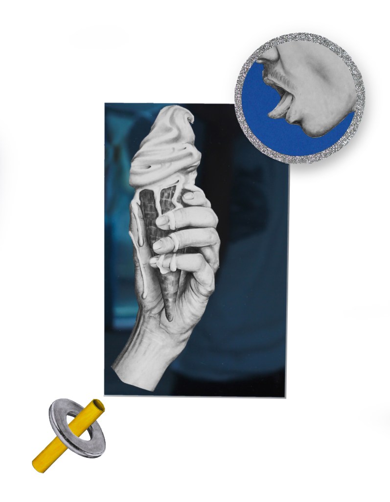 « Cream » est la série sur laquelle je travaille actuellement. Aujourd’hui triptyque, c’est dans la continuité de la série précédente « caresses du soleil » que j’explore ces oeuvres. J’aime l’identité du sud, de quelque chose de chaleureux, solaire et lumineux. Dans cette série je raconte l’histoire d’un bonheur en été, d’une glace échangée mais aussi d’un coeur brisé.