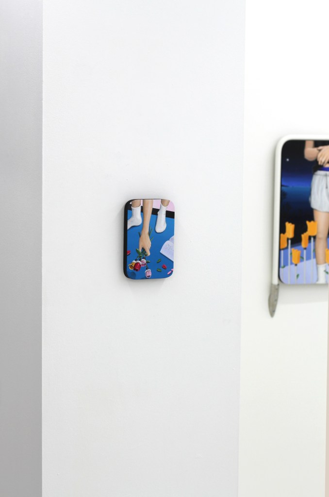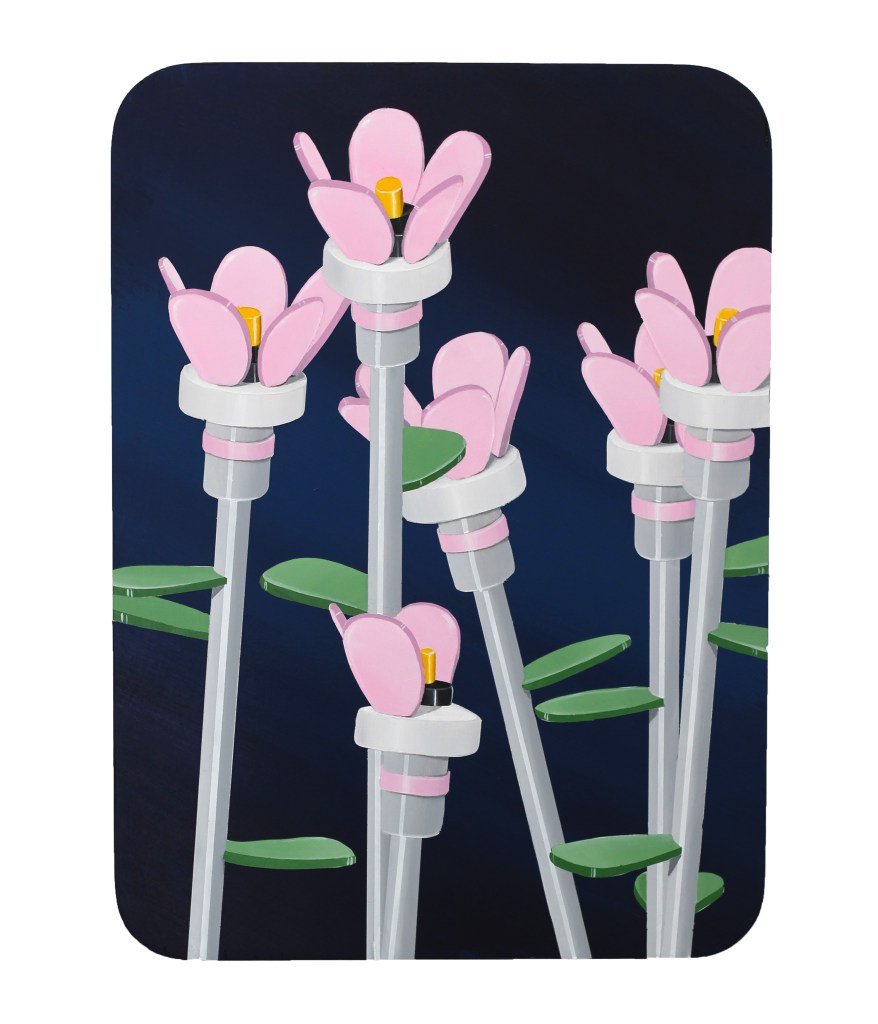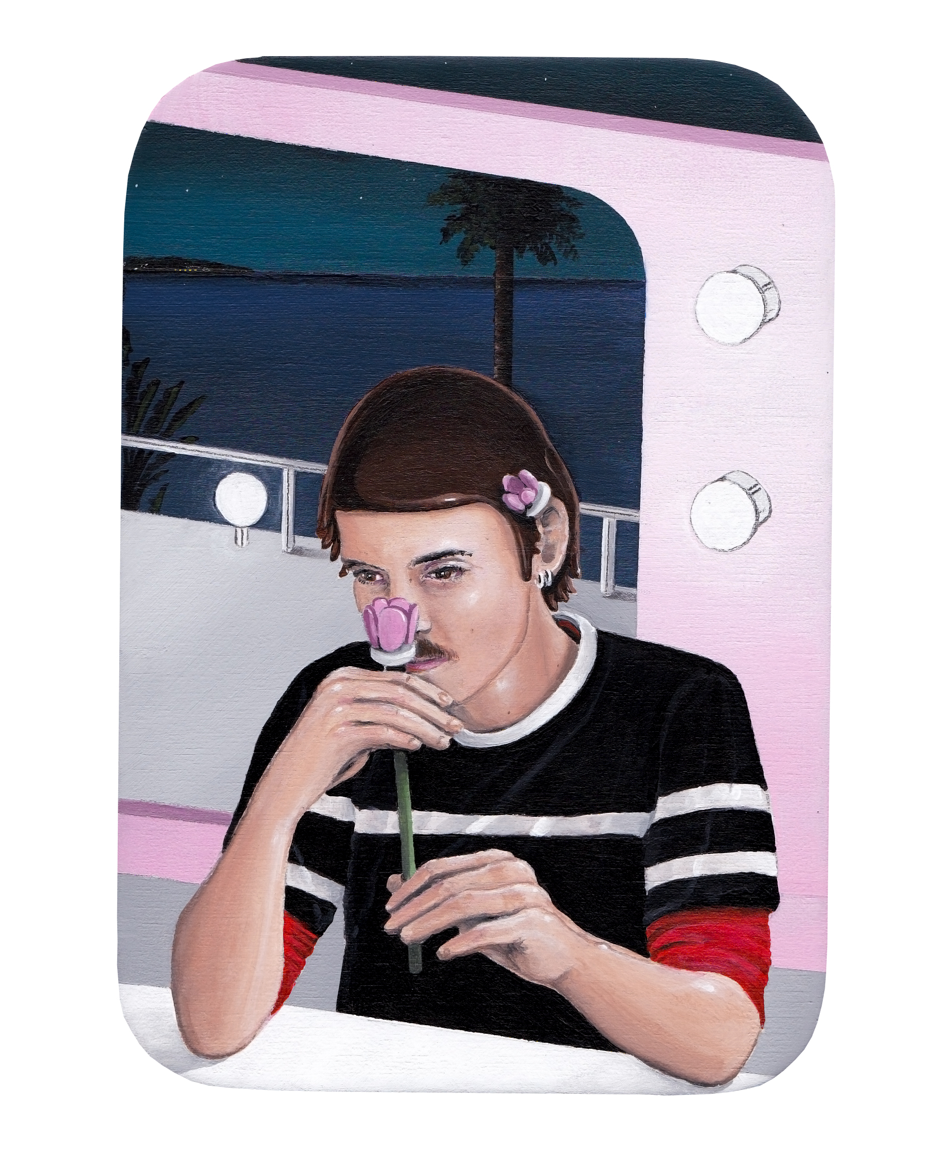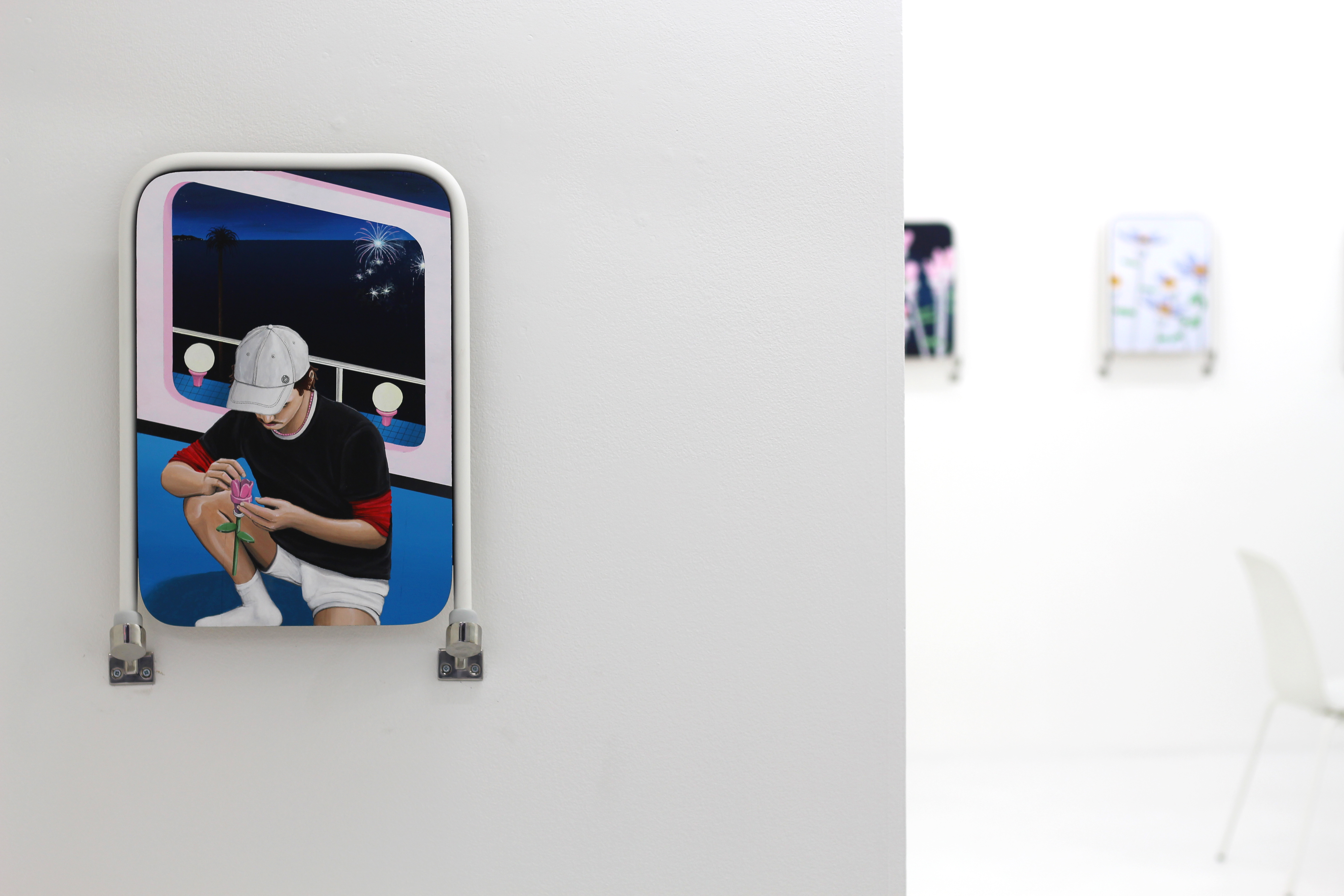 En mêlant une vision atemporelle et universelle à son imaginaire intime, l’artiste nous in- vite à un voyage surréaliste et captivant. Les figures masculines à la plastique parfaite sont placées dans une atmosphère onirique apparemment exempte de narration, entraînant le voyageur dans une quête du beau idéal. Ces silhouettes fantasmagoriques s’inscrivent harmonieusement dans un univers entièrement recomposé par l’artiste au gré de ses souvenirs et d’images contemporaines. Jean Bosphore imagine un monde futuriste où les corps et habitations semblent composés de plastique et se confondent l’un dans l’autre. Dans un monde où les fleurs auraient disparu, il imagine des fleurs artificielles aux couleurs vives qui ponctuent les compositions à la manière d’une mélodie envoûtante.