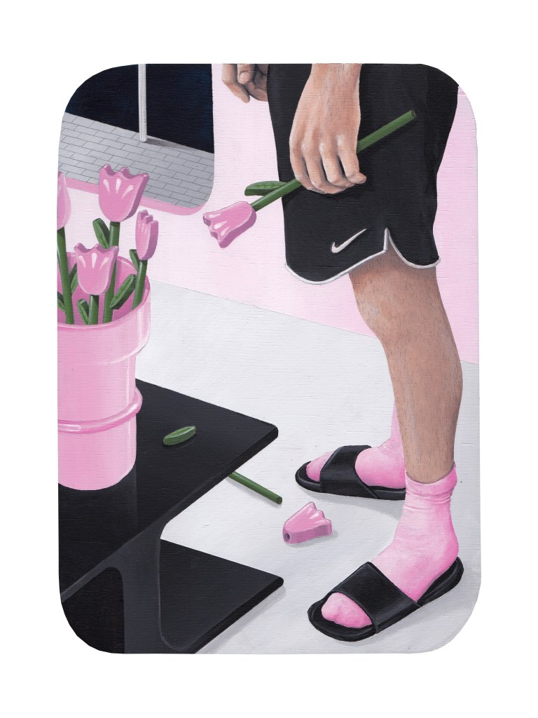 Ces dernières permettent de créer un contraste entre le corps masculin, la sensibilité mais aussi la délicatesse requise à l’assemblage d’une fleur. Ces slumber parties prennent une place primordiale pour l’homme du futur, et l’artiste imagine un monde où virilité et masculinité se confondent avec sensibilité. L’image de l’homme moderne est éprouvée par l’environnement dystopique et futuriste qui l’entoure, et l’œuvre s’enrichit d’une nouvelle lecture, celle de la critique de la société contemporaine qui semble danser immuablement dans une nuit artificielle. En l’absence de narration, le spectateur cherche à offrir un récit imaginé aux personnages et objets, et l’œuvre trouve ainsi son achèvement dans l’esprit du regardeur. Malgré une planéité exacerbée par les aplats de couleur vive, Jean Bosphore parvient à rendre la profondeur de ses espaces avec virtuosité, tout en jouant sur l’incertitude entre intérieur et extérieur.